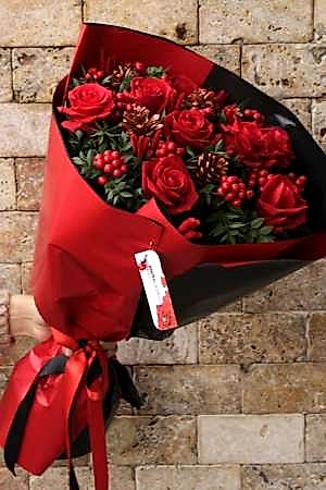 Description: We are with you with our New Year Series. Our bouquet, prepared with red roses, kokina and special pine ornaments, will be one of the best gift choices to celebrate the New Year.