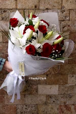 Description: Our bouquet, which is prepared with 3 branches of Lilies and 9 Red Roses, is ready to make your loved one happy.