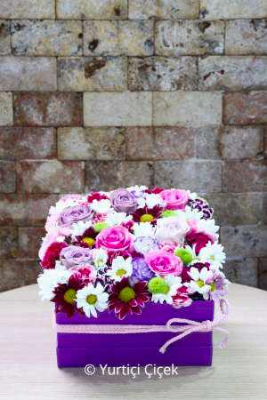 Description: A special design arrangement prepared with roses and wildflowers in a purple box is ready to smile at your loved ones.