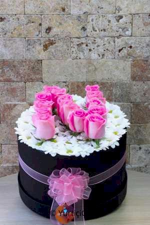 Description: The design, which is prepared with pink roses on the chamomile in the round cylinder box, will add happiness to you every moment.