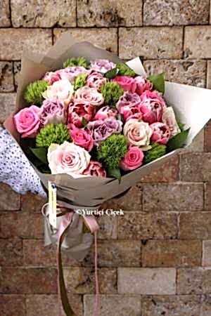 Description: Our bouquet, prepared with 15 piece colorful roses and 10 piece pink tulips, will increase your happiness as you share it.