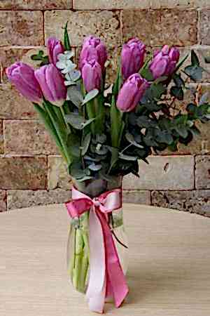 Description: How would you like to send an arrangement of very special purple tulips in a vase for the beautiful beloved who carries all the beauty in his heart? Item Size: 30 cm