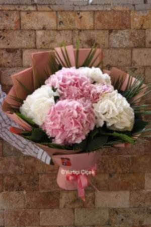 Description: Our most elegant bouquet design, prepared with 3 pink hydrangeas and 3 white hydrangeas, is now with you!