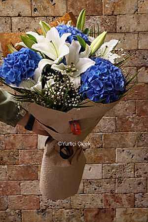 Description: Our elegant bouquet prepared with 3 blue hydrangeas and 3 lilies will add joy to your day.