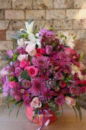Description: A special arrangement in a big box with the freshest colors of the season, white lilies, spidium orchids, anastasia and pink - white - purple.