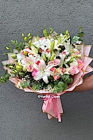 Description: Pembe Gül: 15 Adet Beyaz Lilyum: 5 Dal Cymbidium Orkide: 5 Adet Lisyantus: 5 adet Kullanılan Diğer Ürünler: Pembe ve beyaz gerberalar ile pembe kağıt ambalaj Ürün Boyutu: 60 cm Pembe ve beyazın güzel ve eşsiz uyumunu siz ve sevdikleriniz için sunuyor, taptaze ve mis kokulu sürprizler ile gününüzü güzelleştiriyoruz.